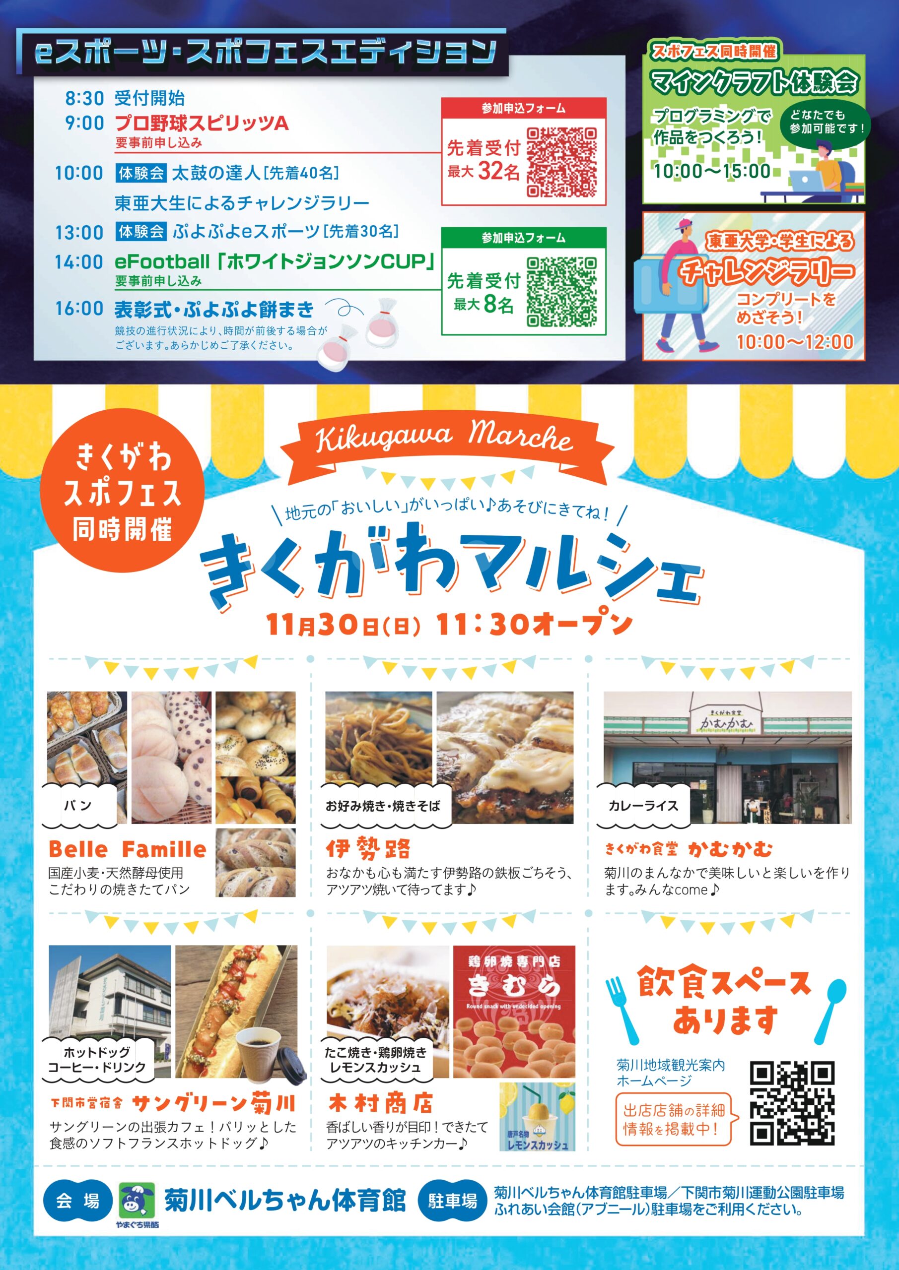 プロ野球スピリッツA(要事前申込)、太鼓の達人体験会(先着40名)、ぷよぷよeスポーツ体験会(先着30名)、efootball「ホワイトジョンソンCUP」(要事前申込)、同時開催:きくがわマルシェ・マインクラフト体験会・チャレンジラリー・ティラノサウルスレース